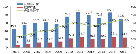 近年來中國機床 市場需求結構加快了變化的速度,普通、低檔數控機床需求大幅度萎縮,大重型和高檔數控機床仍保持穩定需求。2015年 金切機床的産量 69.5萬台、 同比下降19% ,數控金切機床産量24.2萬台、 同比下降 7 % ,産量數控化率逐年提升,保持增長态勢; 2005-201 5 年金切機床産量 如下圖,(單位:萬台)