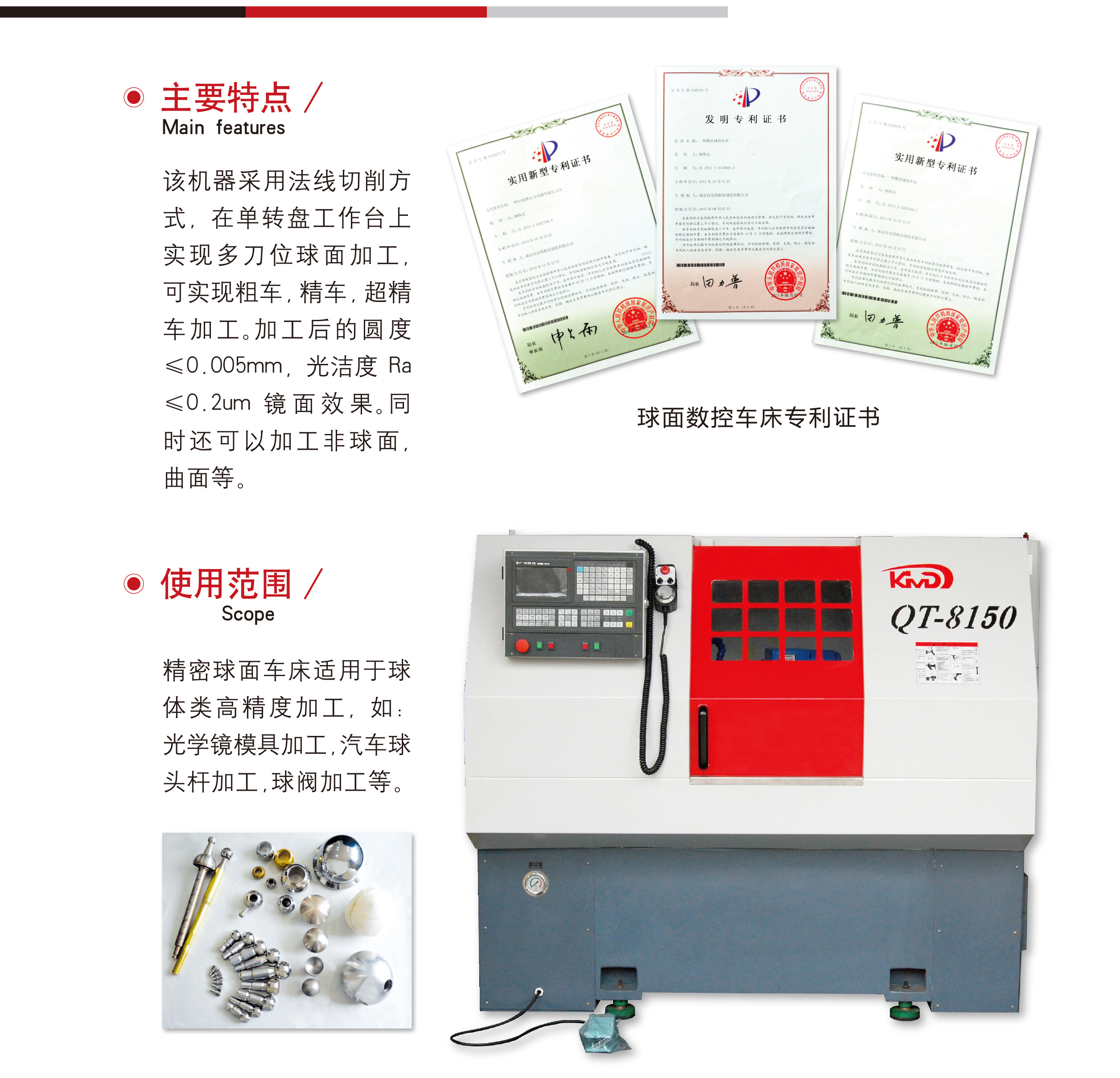 簡要描述: 該機器采用法線切削方式,在單轉盤工作台上實現多刀位球🛌🏻面加工,可實現粗車,精車,超精車加工。加工後的圓度😥≤0.005mm,光潔度Ra≤0.2um鏡面效果。同時還可以加工非球面,曲面等⛹🏻♀️。
