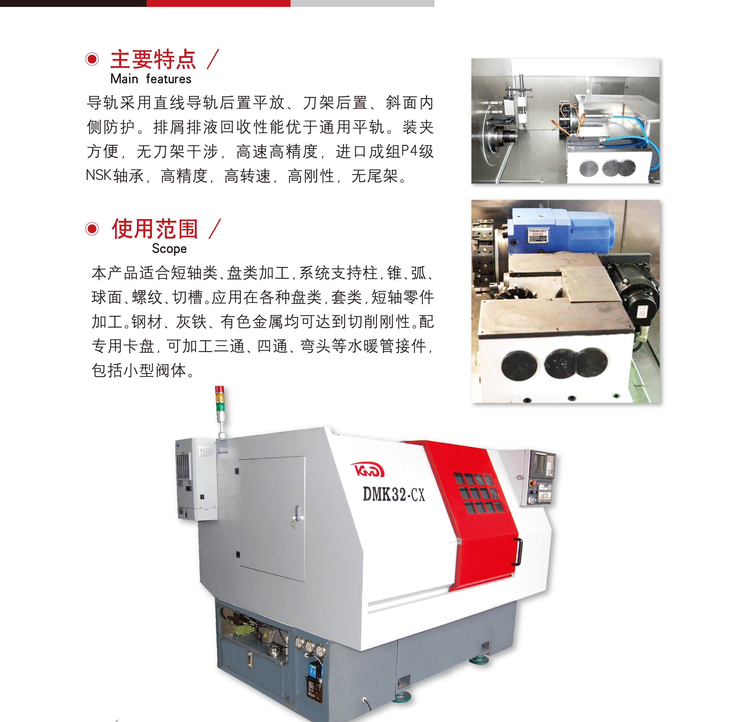 簡要描述: 導軌采用直線導軌後置平放、刀架後置、斜面内側防護😜。排屑排💕液回收性能優于通用平軌。裝夾方便,無刀☠️架幹涉,高速高精度,進口成組P4級NSK軸承,高精度,高轉速,高剛性,無尾架。